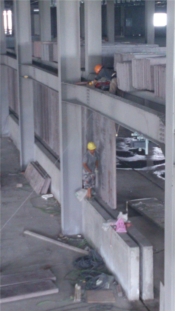 鋼結構廠房裝配式內外墻板工程采用的是中凱建材生產的新型輕質混凝土墻板,其墻板有著高強度釘掛、黏貼能力能力,并且保溫系數非常高、防潮防水、抗震、整體性能好、增加使用面積等特點。